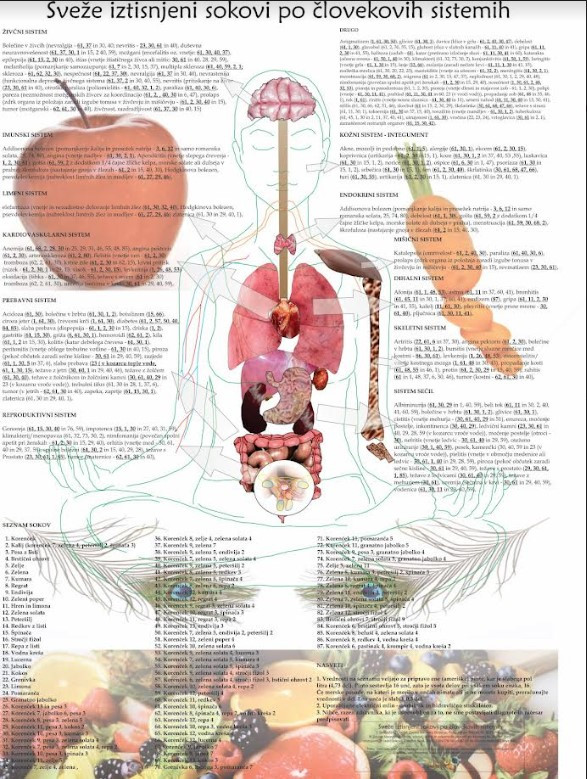 Plakat je priročen prikaz priprave sokov, njihove kombinacije in razmerij živil v soku. Sokovi so razdeljeni po človekovih telesnih sistemih: